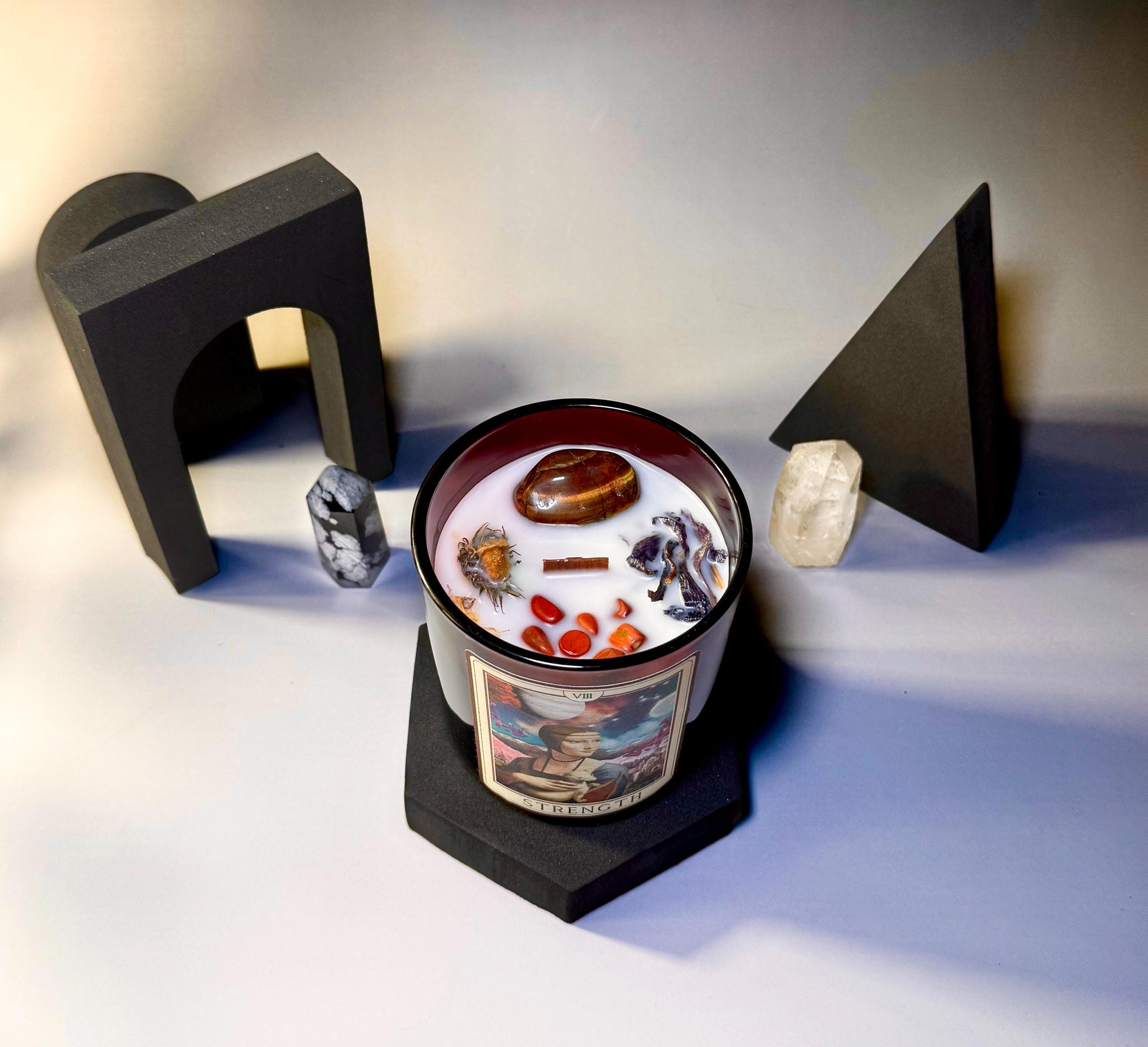 Strength Tarot Candle – Luxury Crystal Candle with Black Violet, Vetiver and Saffron – Empowering Gift for Inner Power and Resilience